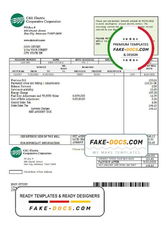 Grab now fully editable USA Arkansas C & L Electric Cooperative Corporation utility bill Template from our website fake docs and put your own info to create a fake copy of Fake USA Arkansas C & L Electric Cooperative Corporation Utility Bill for proof of address and ready your own novelty documents. It’ll be so beneficial if your utility bill is expired, stolen or not available. We also have passport psd template, ID Card psd template, Bank Statement psd template, drivers license psd template & Utility bill psd template