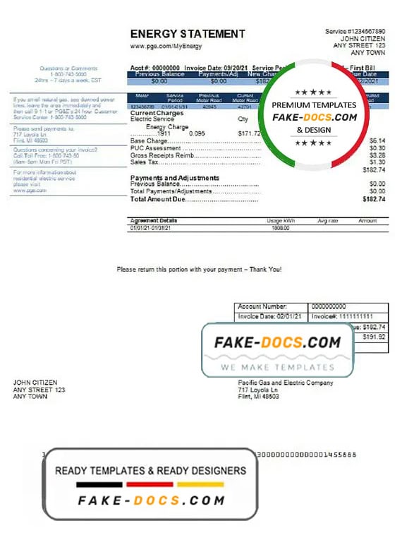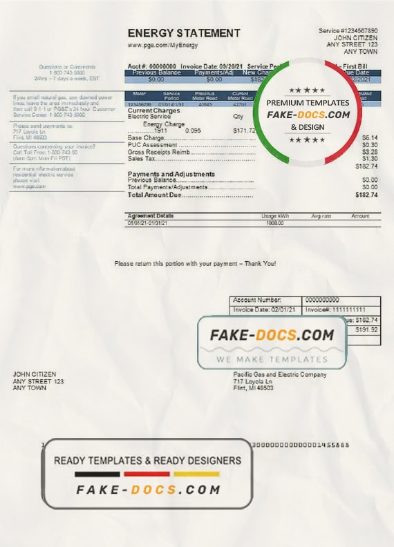 Grab now fully editable USA California PG&E (Pacific Gas and Electric Company) utility bill Template from our website fake docs and put your own info to create a fake copy of Fake USA California PG&E (Pacific Gas and Electric Company) Utility Bill for proof of address and ready your own novelty documents. It’ll be so beneficial if your utility bill is expired, stolen or not available. We also have passport psd template, ID Card psd template, Bank Statement psd template, drivers license psd template & Utility bill psd template