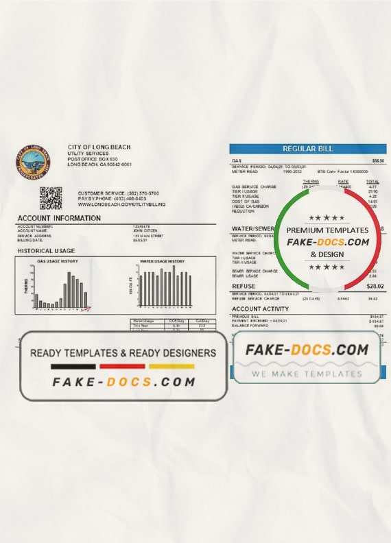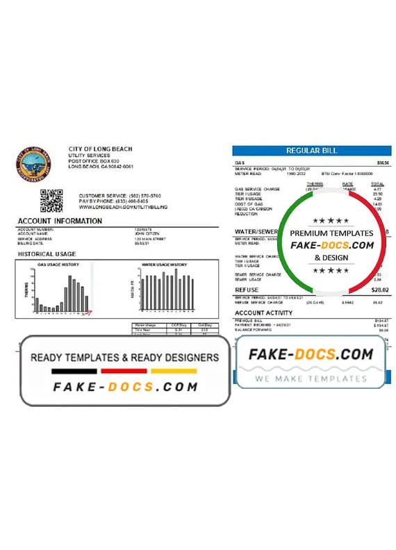 USA City of Long Beach utility bill Word template . Fully editable Word template. High quality template. Easy to customize, Layer based, fonts included. you can edit this template and put any name, address, license number, Id number, birth date, height, weight, expire date etc. This Word template is a easy to Editing.To modify this Word template file you will need a Word editing software such as Microsoft Word. Never used low quality template. Your account may be suspended.