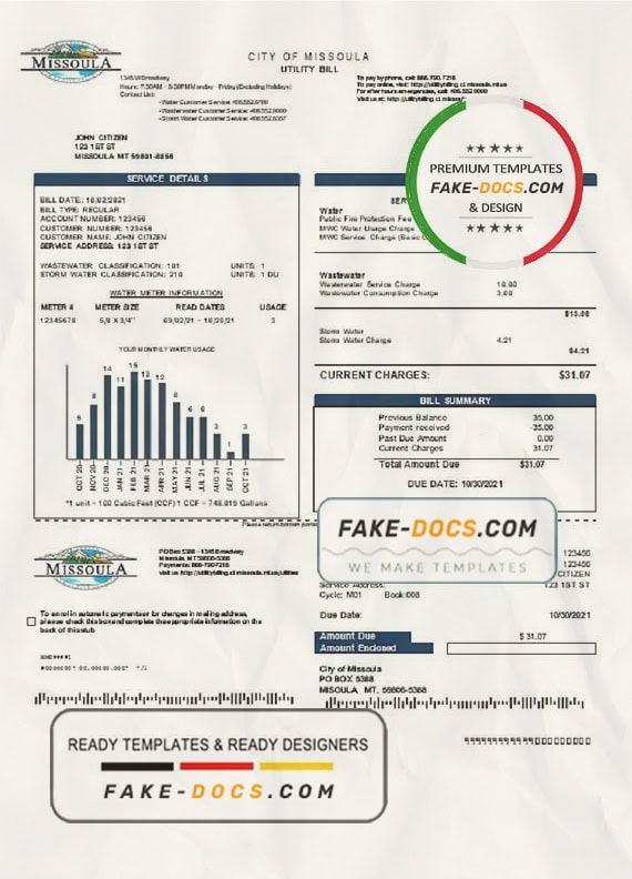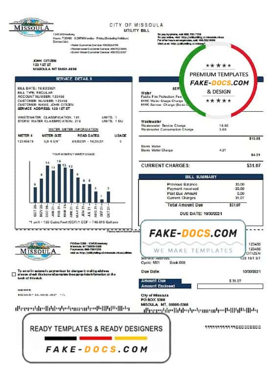 Grab now fully editable USA City of Missoula utility bill Template from our website fake docs and put your own info to create a fake copy of Fake USA City of Missoula Utility Bill for proof of address and ready your own novelty documents. It’ll be so beneficial if your utility bill is expired, stolen or not available. We also have passport psd template, ID Card psd template, Bank Statement psd template, drivers license psd template & Utility bill psd template