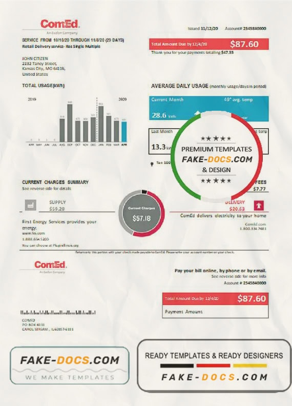 Grab now fully editable USA ComEd utility bill Template from our website fake docs and put your own info to create a fake copy of Fake USA ComEd Utility Bill for proof of address and ready your own novelty documents. It’ll be so beneficial if your utility bill is expired, stolen or not available. We also have passport psd template, ID Card psd template, Bank Statement psd template, drivers license psd template & Utility bill psd template