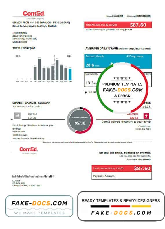USA ComEd utility bill Word template . Fully editable Word template. High quality template. Easy to customize, Layer based, fonts included. you can edit this template and put any name, address, license number, Id number, birth date, height, weight, expire date etc. This Word template is a easy to Editing.To modify this Word template file you will need a Word editing software such as Microsoft Word. Never used low quality template. Your account may be suspended.