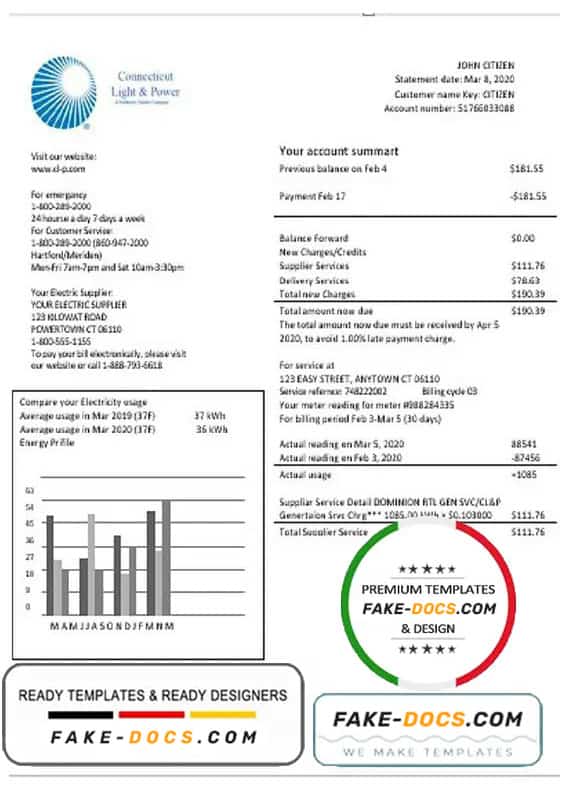 USA Connecticut Light & Power electricity utility bill Word and Pdf Template use for :