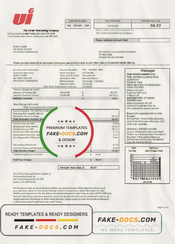 Grab now fully editable USA Connecticut The United Illuminating Company electricity utility bill Template from our website fake docs and put your own info to create a fake copy of Fake USA Connecticut The United Illuminating Company electricity Utility Bill for proof of address and ready your own novelty documents. It’ll be so beneficial if your utility bill is expired, stolen or not available. We also have passport psd template, ID Card psd template, Bank Statement psd template, drivers license psd template & Utility bill psd template
