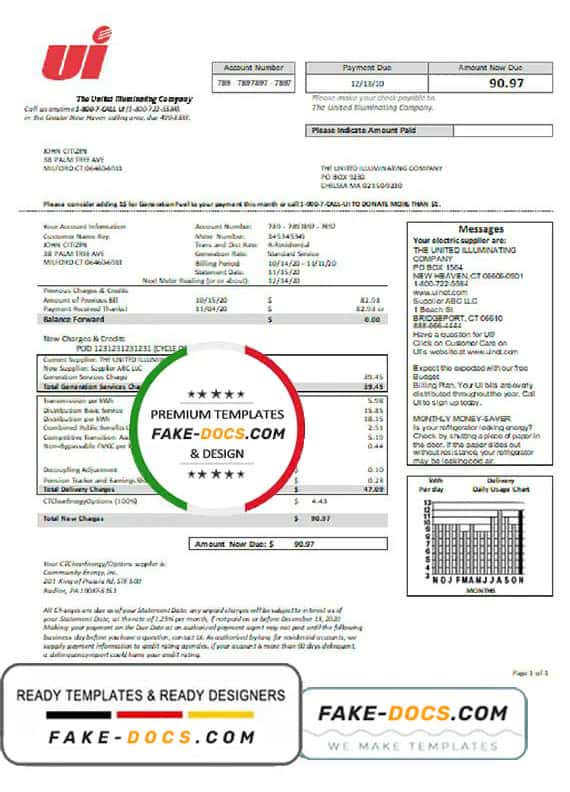USA Connecticut The United Illuminating Company electricity utility bill Word template . Fully editable Word template. High quality template. Easy to customize, Layer based, fonts included. you can edit this template and put any name, address, license number, Id number, birth date, height, weight, expire date etc. This Word template is a easy to Editing.To modify this Word template file you will need a Word editing software such as Microsoft Word. Never used low quality template. Your account may be suspended.