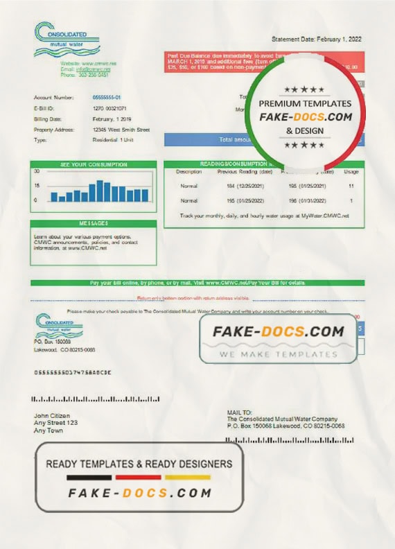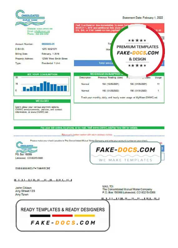 Grab now fully editable USA Consolidated Mutual Water utility bill Template from our website fake docs and put your own info to create a fake copy of Fake USA Consolidated Mutual Water Utility Bill for proof of address and ready your own novelty documents. It’ll be so beneficial if your utility bill is expired, stolen or not available. We also have passport psd template, ID Card psd template, Bank Statement psd template, drivers license psd template & Utility bill psd template