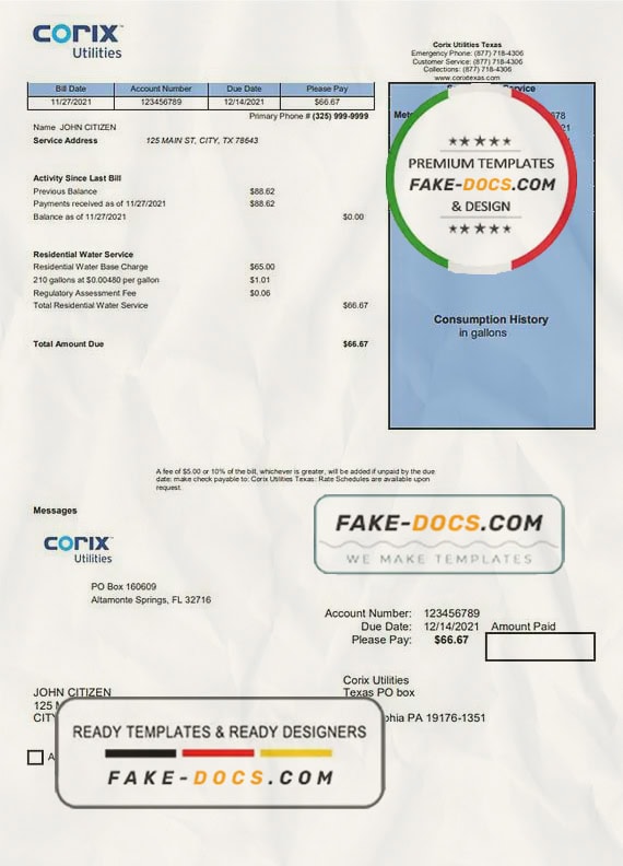 Grab now fully editable USA Corix utility bill Template from our website fake docs and put your own info to create a fake copy of Fake USA Corix Utility Bill for proof of address and ready your own novelty documents. It’ll be so beneficial if your utility bill is expired, stolen or not available. We also have passport psd template, ID Card psd template, Bank Statement psd template, drivers license psd template & Utility bill psd template