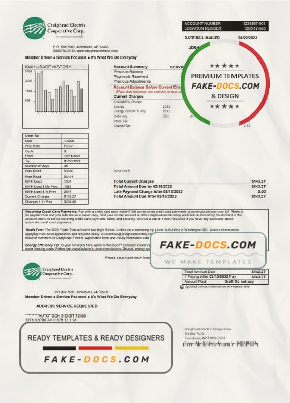 Grab now fully editable USA Craighead Electric utility bill Template from our website fake docs and put your own info to create a fake copy of Fake USA Craighead Electric Utility Bill for proof of address and ready your own novelty documents. It’ll be so beneficial if your utility bill is expired, stolen or not available. We also have passport psd template, ID Card psd template, Bank Statement psd template, drivers license psd template & Utility bill psd template