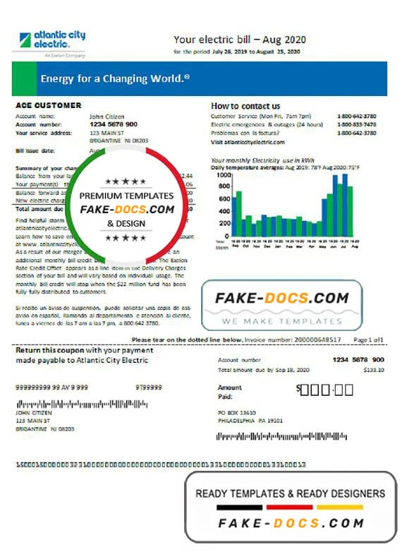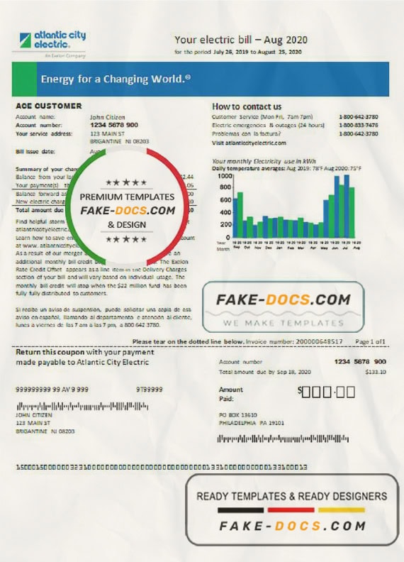 Grab now fully editable USA Delaware Atlantic City Electric electricity utility bill Template from our website fake docs and put your own info to create a fake copy of Fake USA Delaware Atlantic City Electric electricity Utility Bill for proof of address and ready your own novelty documents. It’ll be so beneficial if your utility bill is expired, stolen or not available. We also have passport psd template, ID Card psd template, Bank Statement psd template, drivers license psd template & Utility bill psd template