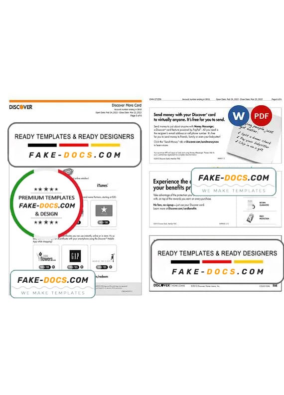 USA Discover credit card Bank Statement Word template . Fully editable Word template. High quality template. Easy to customize, Layer based, fonts included. you can edit this template and put any name, address, license number, Id number, birth date, height, weight, expire date, change photos etc. This Word template is a easy to Editing.To modify this Word template file you will need a Word editing software such as Microsoft Word. Never used low quality template. Your account may be suspended.