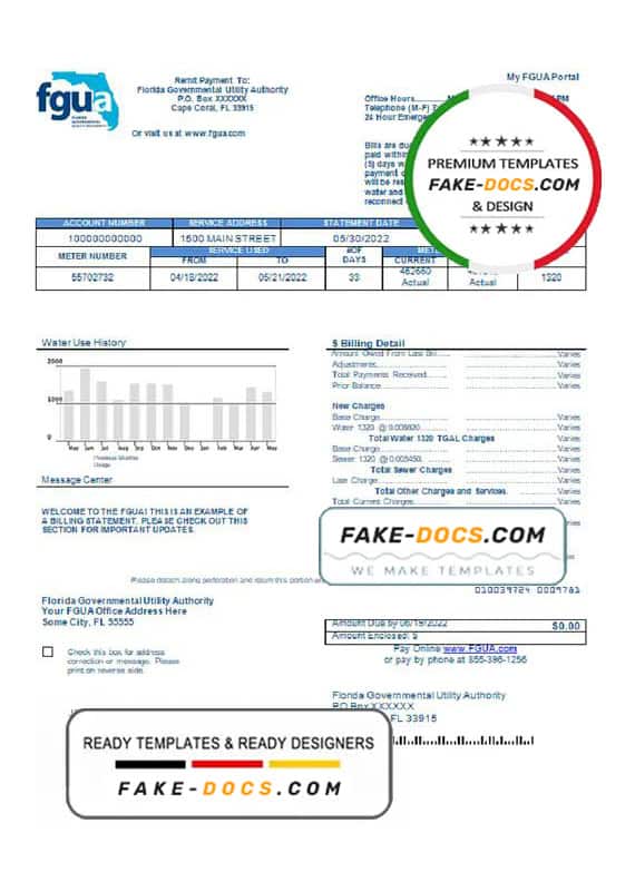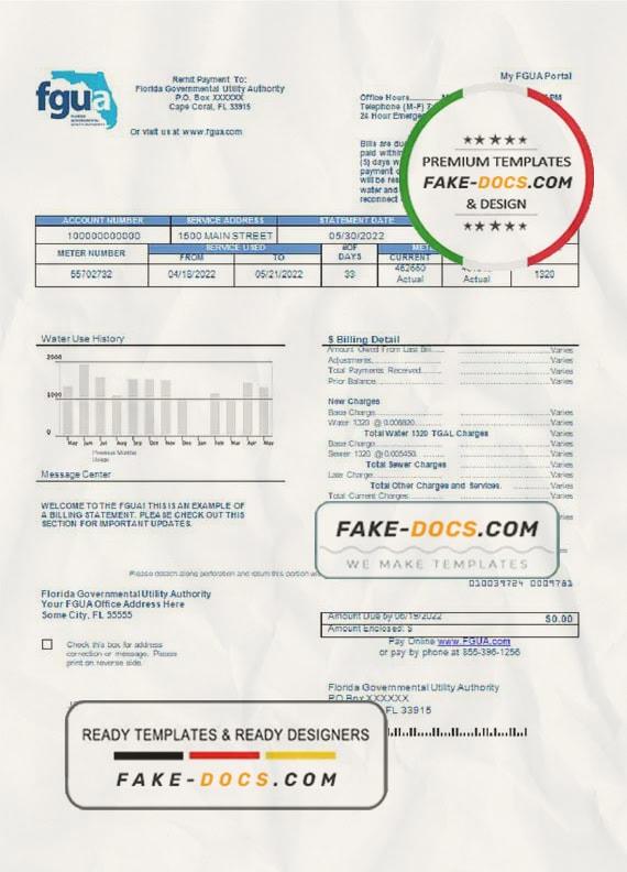Grab now fully editable USA Florida FGUA utility bill Template from our website fake docs and put your own info to create a fake copy of Fake USA Florida FGUA Utility Bill for proof of address and ready your own novelty documents. It’ll be so beneficial if your utility bill is expired, stolen or not available. We also have passport psd template, ID Card psd template, Bank Statement psd template, drivers license psd template & Utility bill psd template