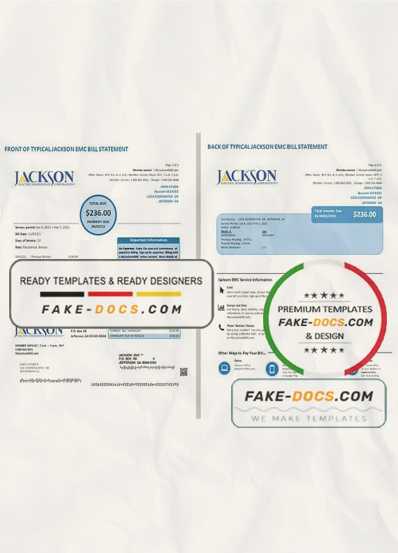 USA Georgia JACKSON EMC utility bill Word template . Fully editable Word template. High quality template. Easy to customize, Layer based, fonts included. you can edit this template and put any name, address, license number, Id number, birth date, height, weight, expire date etc. This Word template is a easy to Editing.To modify this Word template file you will need a Word editing software such as Microsoft Word. Never used low quality template. Your account may be suspended.