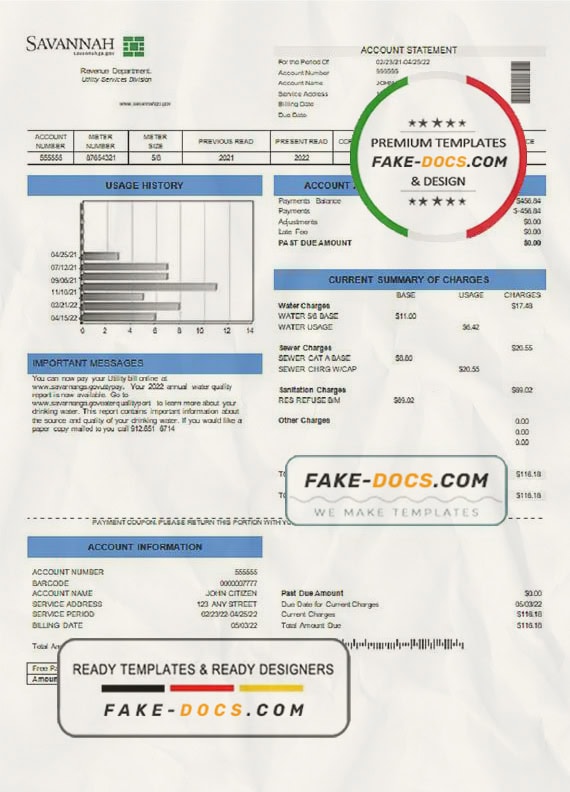 Grab now fully editable USA Georgia Savannah utility bill Template from our website fake docs and put your own info to create a fake copy of Fake USA Georgia Savannah Utility Bill for proof of address and ready your own novelty documents. It’ll be so beneficial if your utility bill is expired, stolen or not available. We also have passport psd template, ID Card psd template, Bank Statement psd template, drivers license psd template & Utility bill psd template