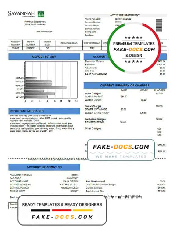 USA Georgia Savannah utility bill Word template . Fully editable Word template. High quality template. Easy to customize, Layer based, fonts included. you can edit this template and put any name, address, license number, Id number, birth date, height, weight, expire date etc. This Word template is a easy to Editing.To modify this Word template file you will need a Word editing software such as Microsoft Word. Never used low quality template. Your account may be suspended.