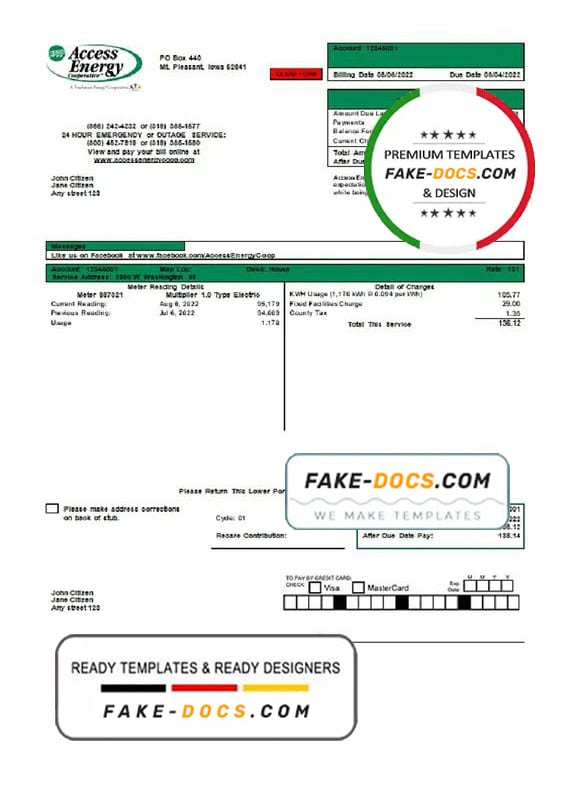 Grab now fully editable USA Iowa Access Energy Cooperative utility bill Template from our website fake docs and put your own info to create a fake copy of Fake USA Iowa Access Energy Cooperative Utility Bill for proof of address and ready your own novelty documents. It’ll be so beneficial if your utility bill is expired, stolen or not available. We also have passport psd template, ID Card psd template, Bank Statement psd template, drivers license psd template & Utility bill psd template