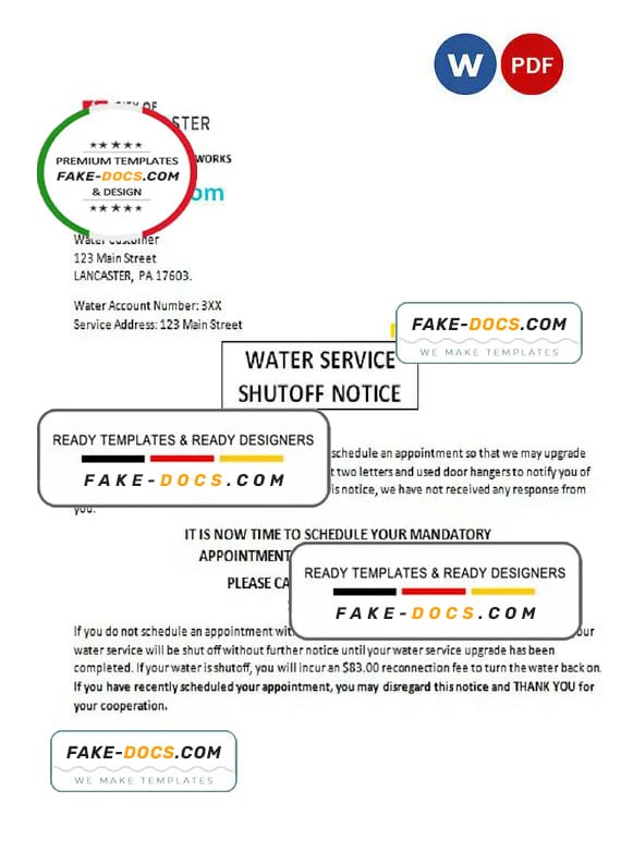 USA Lancaster Water service utility bill Word template . Fully editable Word  template. High quality template. Easy to customize, Layer based, fonts included. you can edit this template and  put any name, address, license number, Id number, birth date, height, weight, expire date etc. This Word  template is a easy to Editing.To modify this Word template file you will need a Word editing software such as Microsoft Word. Never used low quality template. Your account may be suspended.