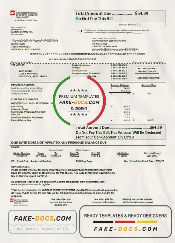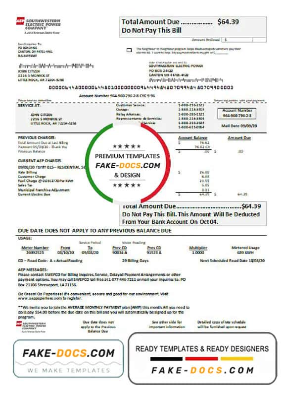 USA Louisiana AEP (Southwestern Electric Power Company) electricity utility bill Word template . Fully editable Word  template. High quality template. Easy to customize, Layer based, fonts included. you can edit this template and  put any name, address, license number, Id number, birth date, height, weight, expire date etc. This Word  template is a easy to Editing.To modify this Word template file you will need a Word editing software such as Microsoft Word. Never used low quality template. Your account may be suspended.