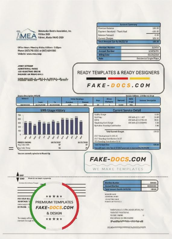 Grab now fully editable USA MEA Alaska electricity utility bill Template from our website fake docs and put your own info to create a fake copy of Fake USA MEA Alaska electricity Utility Bill for proof of address and ready your own novelty documents. It’ll be so beneficial if your utility bill is expired, stolen or not available. We also have passport psd template, ID Card psd template, Bank Statement psd template, drivers license psd template & Utility bill psd template