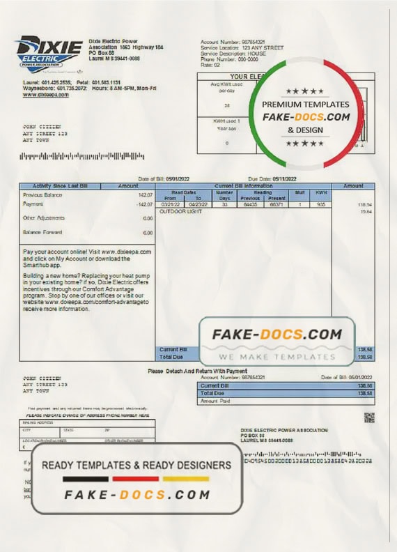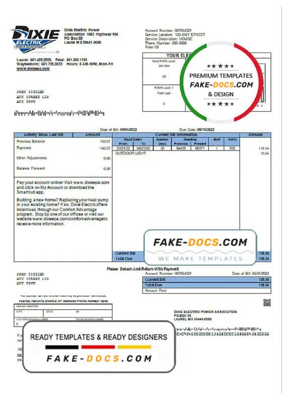Grab now fully editable USA Mississippi Dixie Electric utility bill Template from our website fake docs and put your own info to create a fake copy of Fake USA Mississippi Dixie Electric Utility Bill for proof of address and ready your own novelty documents. It’ll be so beneficial if your utility bill is expired, stolen or not available. We also have passport psd template, ID Card psd template, Bank Statement psd template, drivers license psd template & Utility bill psd template