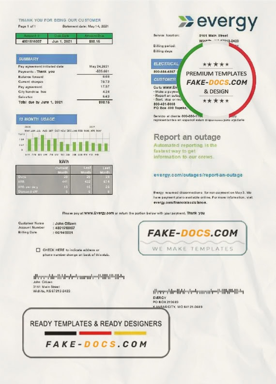 Grab now fully editable USA Missouri Evergy electricity utility bill Template from our website fake docs and put your own info to create a fake copy of Fake USA Missouri Evergy electricity Utility Bill for proof of address and ready your own novelty documents. It’ll be so beneficial if your utility bill is expired, stolen or not available. We also have passport psd template, ID Card psd template, Bank Statement psd template, drivers license psd template & Utility bill psd template