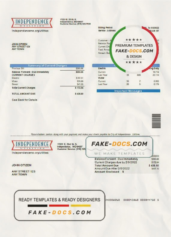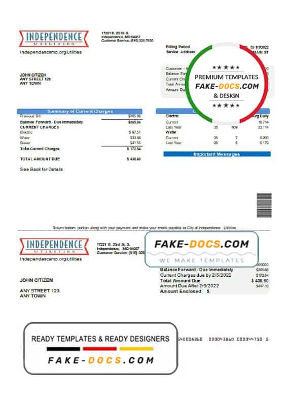 Grab now fully editable USA Missouri Independence Utilities utility bill Template from our website fake docs and put your own info to create a fake copy of Fake USA Missouri Independence Utilities Utility Bill for proof of address and ready your own novelty documents. It’ll be so beneficial if your utility bill is expired, stolen or not available. We also have passport psd template, ID Card psd template, Bank Statement psd template, drivers license psd template & Utility bill psd template