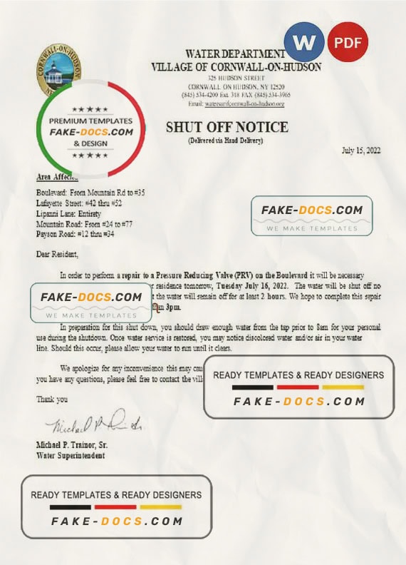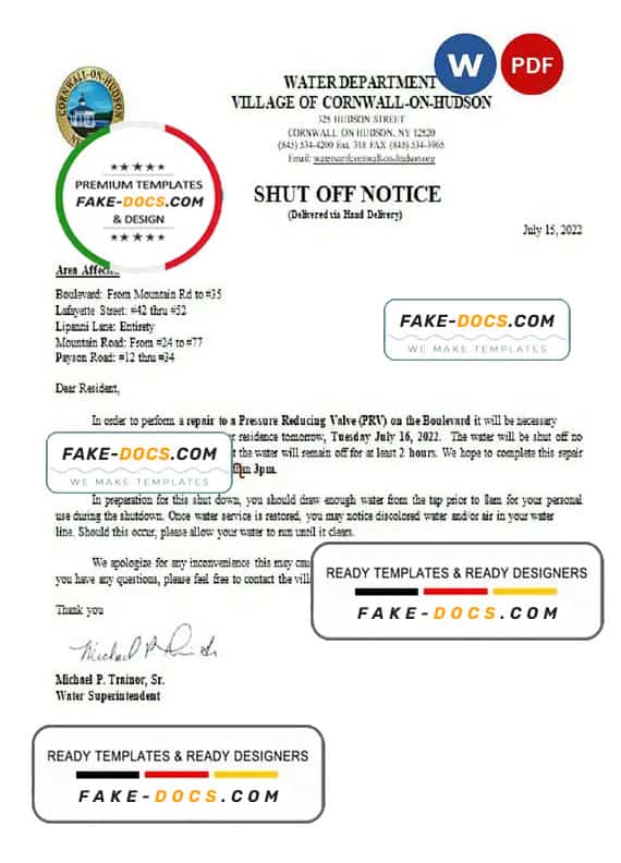 USA New York Cornwall-on-Hudson water utility bill Word template . Fully editable Word template. High quality template. Easy to customize, Layer based, fonts included. you can edit this template and put any name, address, license number, Id number, birth date, height, weight, expire date etc. This Word template is a easy to Editing.To modify this Word template file you will need a Word editing software such as Microsoft Word. Never used low quality template. Your account may be suspended.