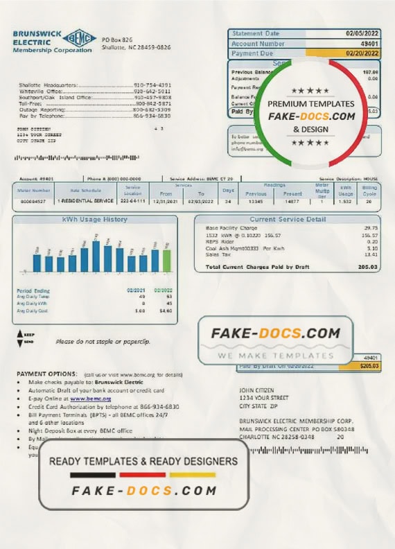 Grab now fully editable USA North Carolina Brunswick Electric utility bill Template from our website fake docs and put your own info to create a fake copy of Fake USA North Carolina Brunswick Electric Utility Bill for proof of address and ready your own novelty documents. It’ll be so beneficial if your utility bill is expired, stolen or not available. We also have passport psd template, ID Card psd template, Bank Statement psd template, drivers license psd template & Utility bill psd template