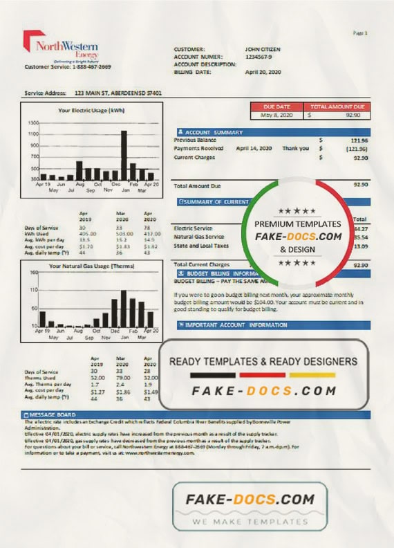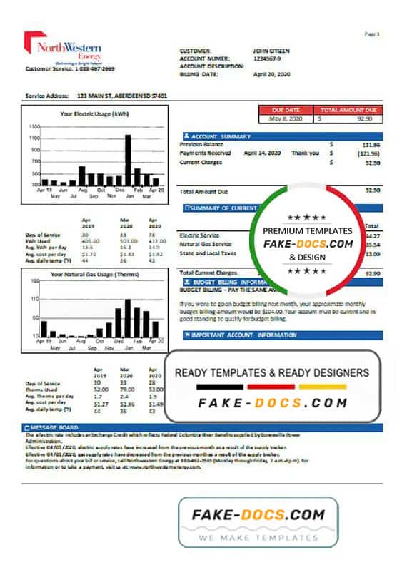 USA NorthWestern Energy utility bill Word template . Fully editable Word template. High quality template. Easy to customize, Layer based, fonts included. you can edit this template and put any name, address, license number, Id number, birth date, height, weight, expire date etc. This Word template is a easy to Editing.To modify this Word template file you will need a Word editing software such as Microsoft Word. Never used low quality template. Your account may be suspended.