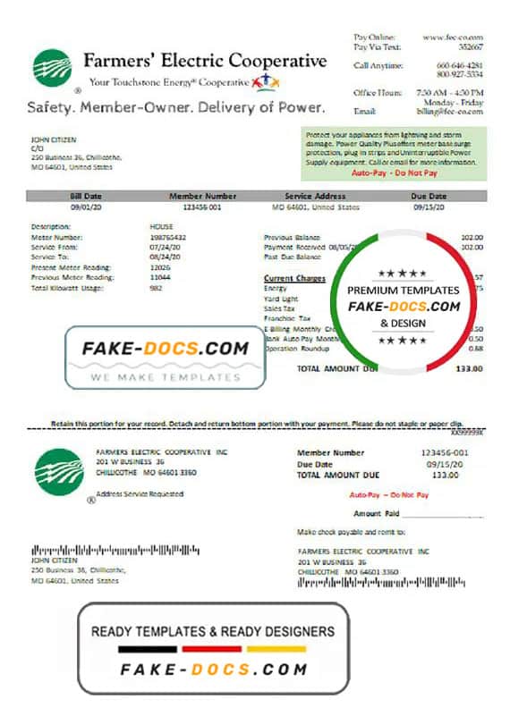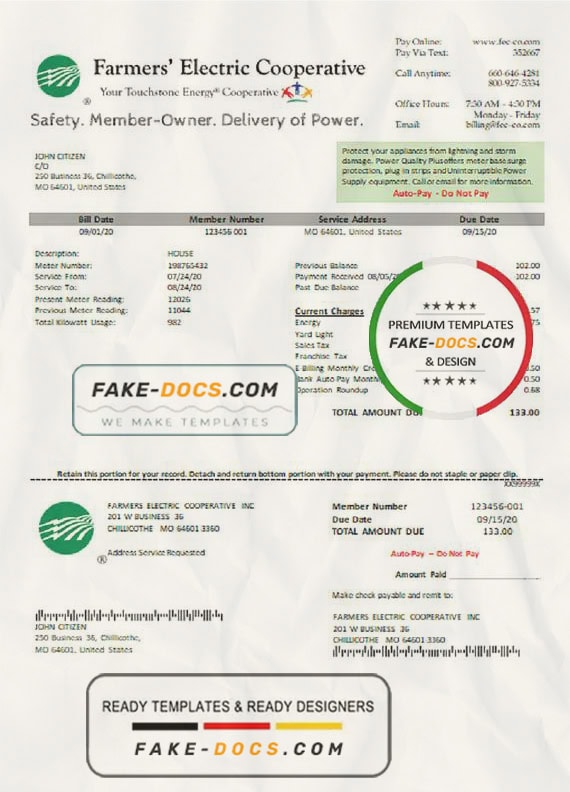 Grab now fully editable USA Ohio Farmer’s Electric Cooperative utility bill Template from our website fake docs and put your own info to create a fake copy of Fake USA Ohio Farmer’s Electric Cooperative Utility Bill for proof of address and ready your own novelty documents. It’ll be so beneficial if your utility bill is expired, stolen or not available. We also have passport psd template, ID Card psd template, Bank Statement psd template, drivers license psd template & Utility bill psd template