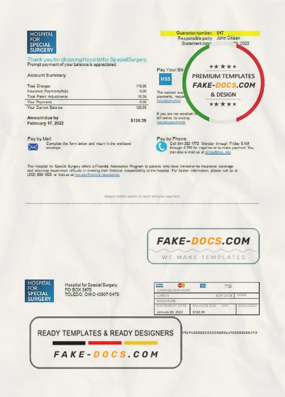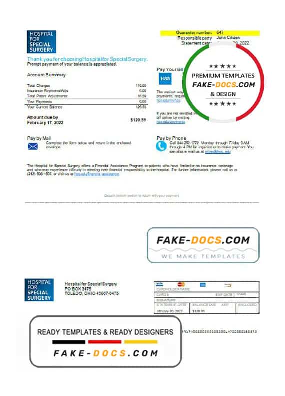 Grab now fully editable USA Ohio Hospital For Special Surgery utility bill Template from our website fake docs and put your own info to create a fake copy of Fake USA Ohio Hospital For Special Surgery Utility Bill for proof of address and ready your own novelty documents. It’ll be so beneficial if your utility bill is expired, stolen or not available. We also have passport psd template, ID Card psd template, Bank Statement psd template, drivers license psd template & Utility bill psd template