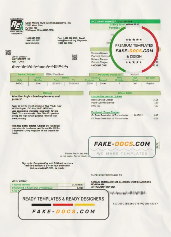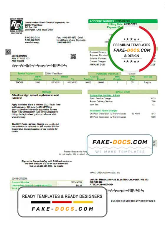 Grab now fully editable USA Ohio Lorain-Medina Rural Electric utility bill Template from our website fake docs and put your own info to create a fake copy of Fake USA Ohio Lorain-Medina Rural Electric Utility Bill for proof of address and ready your own novelty documents. It’ll be so beneficial if your utility bill is expired, stolen or not available. We also have passport psd template, ID Card psd template, Bank Statement psd template, drivers license psd template & Utility bill psd template