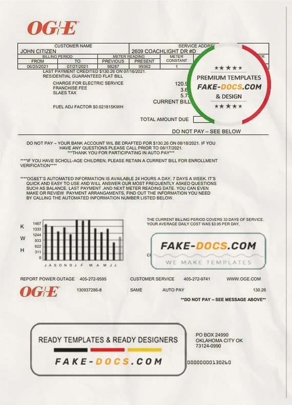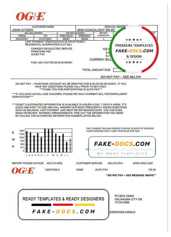 USA Oklahoma OGE Energy utility bill Word and Pdf Template use for :