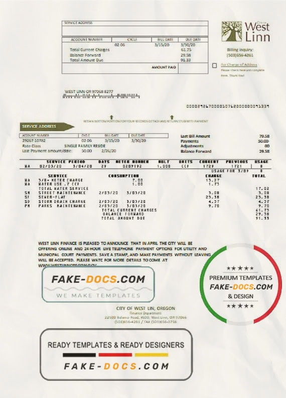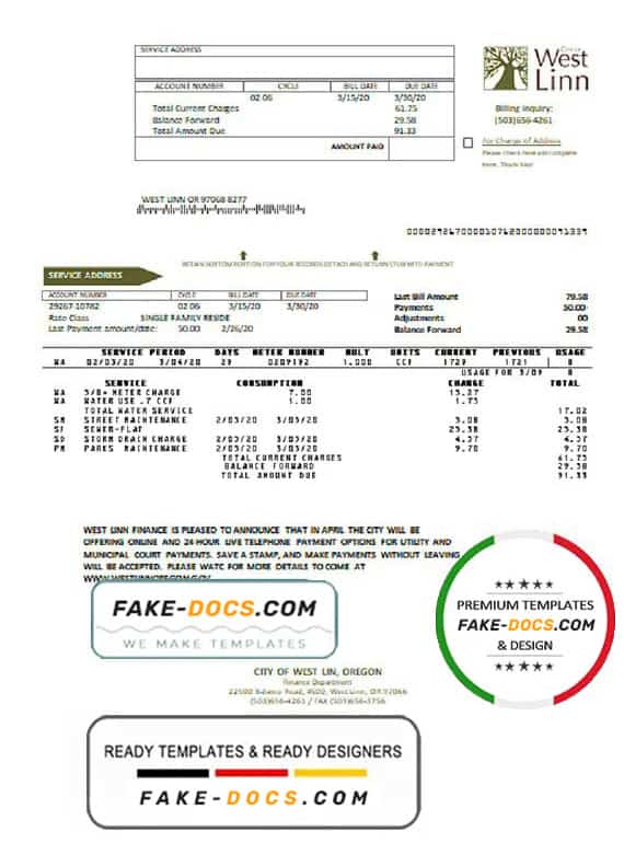 Grab now fully editable USA Oregon City of West Linn utility bill Template from our website fake docs and put your own info to create a fake copy of Fake USA Oregon City of West Linn Utility Bill for proof of address and ready your own novelty documents. It’ll be so beneficial if your utility bill is expired, stolen or not available. We also have passport psd template, ID Card psd template, Bank Statement psd template, drivers license psd template & Utility bill psd template