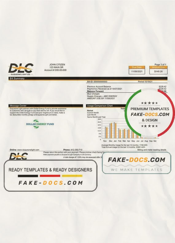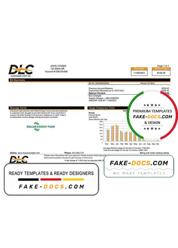 Grab now fully editable USA Pennsylvania Duquesne Light Company (DLC) utility bill Template from our website fake docs and put your own info to create a fake copy of Fake USA Pennsylvania Duquesne Light Company (DLC) Utility Bill for proof of address and ready your own novelty documents. It’ll be so beneficial if your utility bill is expired, stolen or not available. We also have passport psd template, ID Card psd template, Bank Statement psd template, drivers license psd template & Utility bill psd template