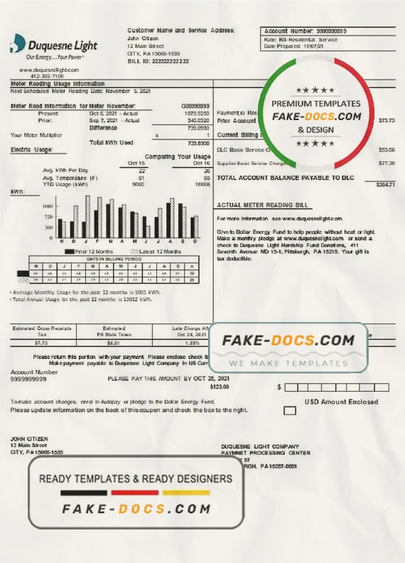 Grab now fully editable USA Pennsylvania Duquesne Light Company utility bill Template from our website fake docs and put your own info to create a fake copy of Fake USA Pennsylvania Duquesne Light Company Utility Bill for proof of address and ready your own novelty documents. It’ll be so beneficial if your utility bill is expired, stolen or not available. We also have passport psd template, ID Card psd template, Bank Statement psd template, drivers license psd template & Utility bill psd template