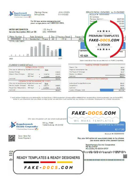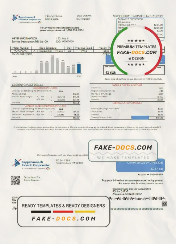 Grab now fully editable USA Rappahannock Electric Cooperative utility bill Template from our website fake docs and put your own info to create a fake copy of Fake USA Rappahannock Electric Cooperative Utility Bill for proof of address and ready your own novelty documents. It’ll be so beneficial if your utility bill is expired, stolen or not available. We also have passport psd template, ID Card psd template, Bank Statement psd template, drivers license psd template & Utility bill psd template