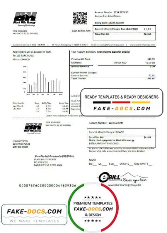 USA South Dakota Black Hills Energy utility bill Word and Pdf Template use for :