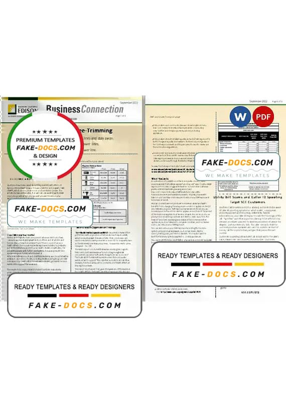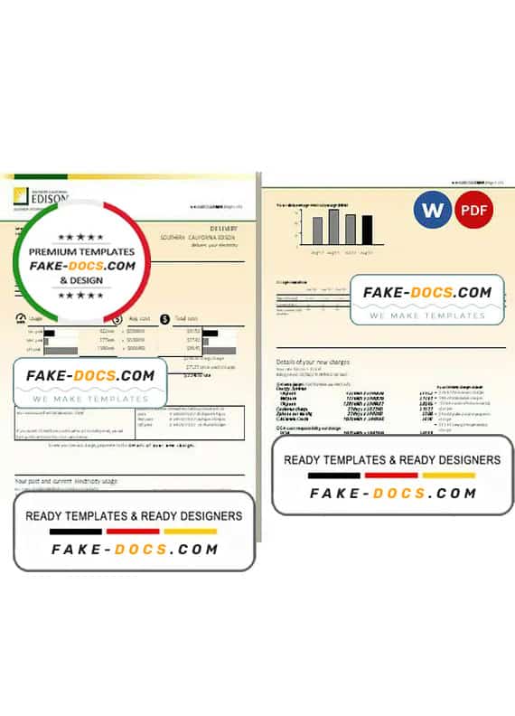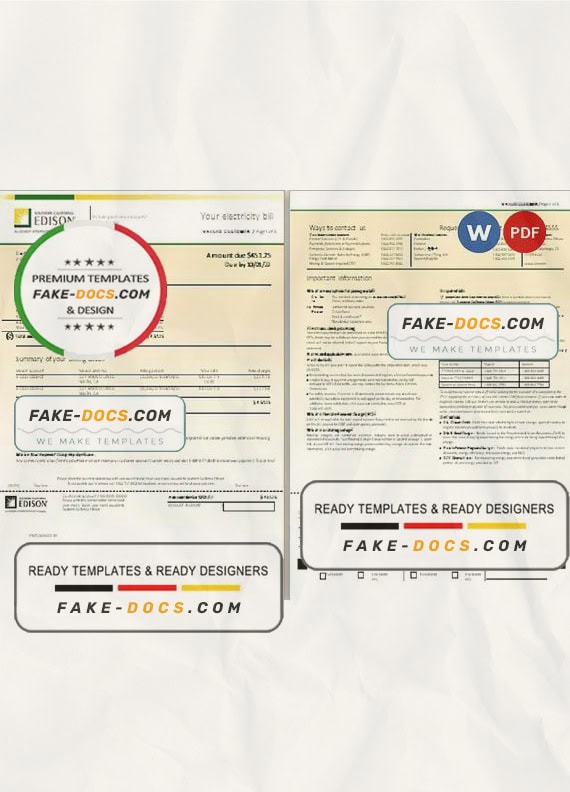 USA Southern California EDISON utility bill Word template . Fully editable Word template. High quality template. Easy to customize, Layer based, fonts included. you can edit this template and put any name, address, license number, Id number, birth date, height, weight, expire date etc. This Word template is a easy to Editing.To modify this Word template file you will need a Word editing software such as Microsoft Word. Never used low quality template. Your account may be suspended.