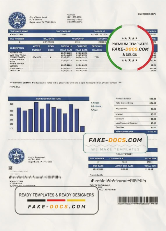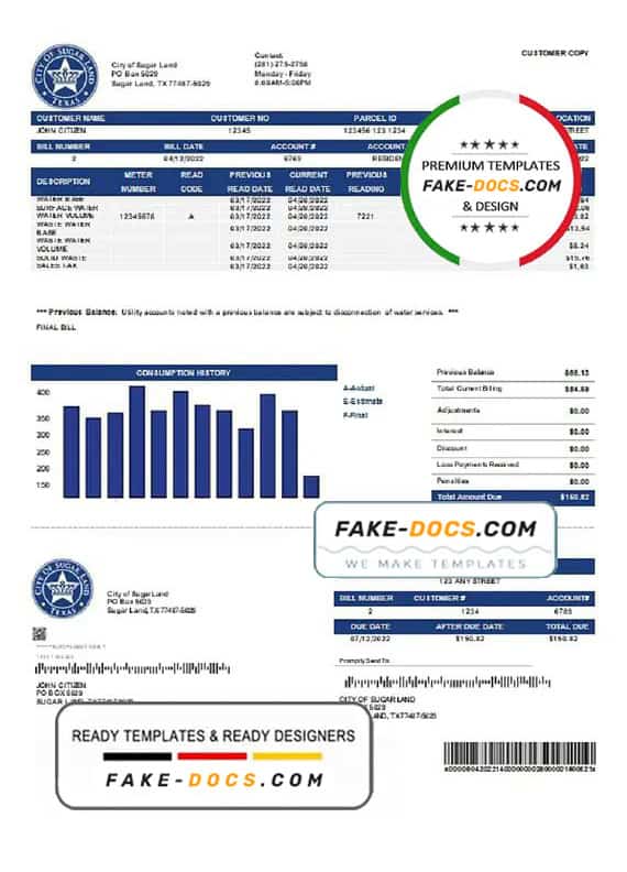 Grab now fully editable USA Texas City of Sugar Land utility bill Template from our website fake docs and put your own info to create a fake copy of Fake USA Texas City of Sugar Land Utility Bill for proof of address and ready your own novelty documents. It’ll be so beneficial if your utility bill is expired, stolen or not available. We also have passport psd template, ID Card psd template, Bank Statement psd template, drivers license psd template & Utility bill psd template