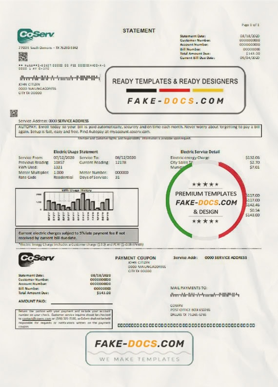 Grab now fully editable USA Texas CoServ utility bill Template from our website fake docs and put your own info to create a fake copy of Fake USA Texas CoServ Utility Bill for proof of address and ready your own novelty documents. It’ll be so beneficial if your utility bill is expired, stolen or not available. We also have passport psd template, ID Card psd template, Bank Statement psd template, drivers license psd template & Utility bill psd template