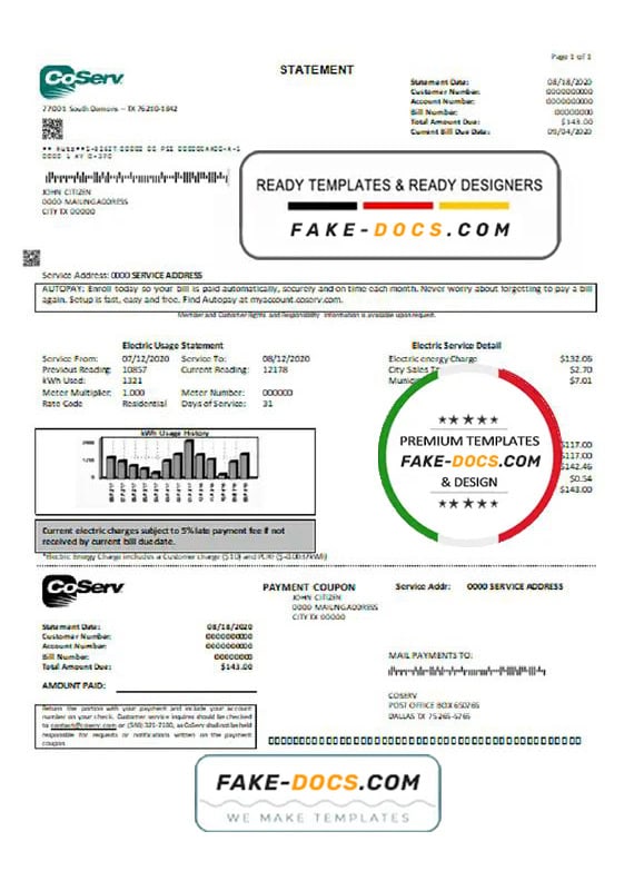 USA Texas CoServ utility bill Word template . Fully editable Word template. High quality template. Easy to customize, Layer based, fonts included. you can edit this template and put any name, address, license number, Id number, birth date, height, weight, expire date etc. This Word template is a easy to Editing.To modify this Word template file you will need a Word editing software such as Microsoft Word. Never used low quality template. Your account may be suspended.