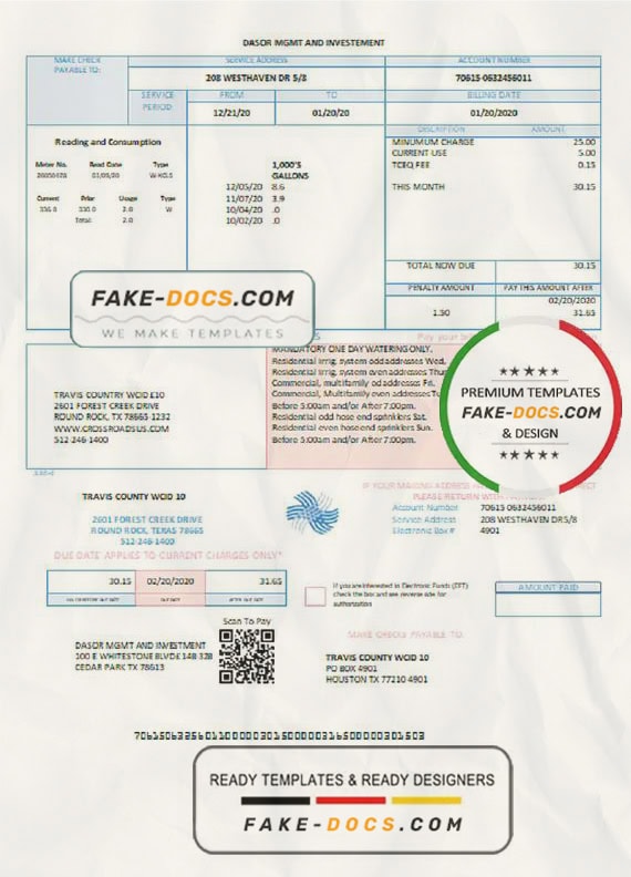 USA Texas Dasor Management and Investment utility bill Word template . Fully editable Word template. High quality template. Easy to customize, Layer based, fonts included. you can edit this template and put any name, address, license number, Id number, birth date, height, weight, expire date etc. This Word template is a easy to Editing.To modify this Word template file you will need a Word editing software such as Microsoft Word. Never used low quality template. Your account may be suspended.