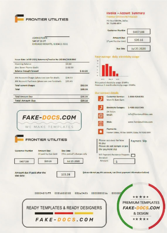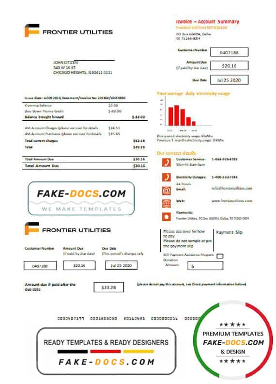 Grab now fully editable USA Texas Frontier Utilities utility bill Template from our website fake docs and put your own info to create a fake copy of Fake USA Texas Frontier Utilities Utility Bill for proof of address and ready your own novelty documents. It’ll be so beneficial if your utility bill is expired, stolen or not available. We also have passport psd template, ID Card psd template, Bank Statement psd template, drivers license psd template & Utility bill psd template