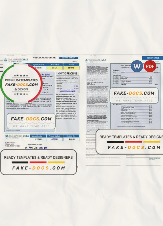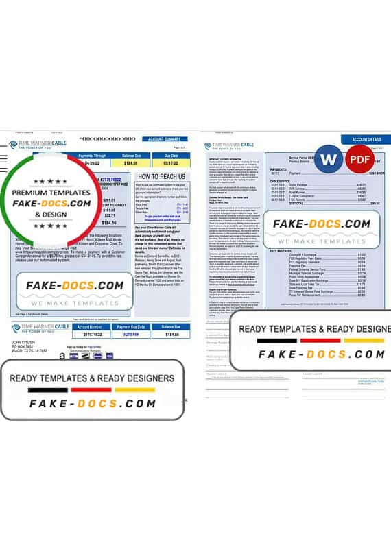 USA Time Warner Cabel utility bill Word template . Fully editable Word template. High quality template. Easy to customize, Layer based, fonts included. you can edit this template and put any name, address, license number, Id number, birth date, height, weight, expire date etc. This Word template is a easy to Editing.To modify this Word template file you will need a Word editing software such as Microsoft Word. Never used low quality template. Your account may be suspended.
