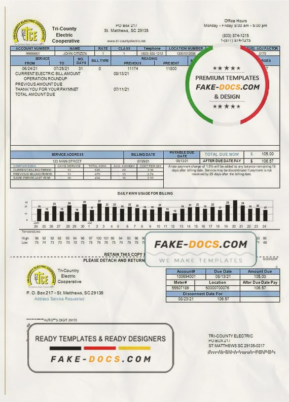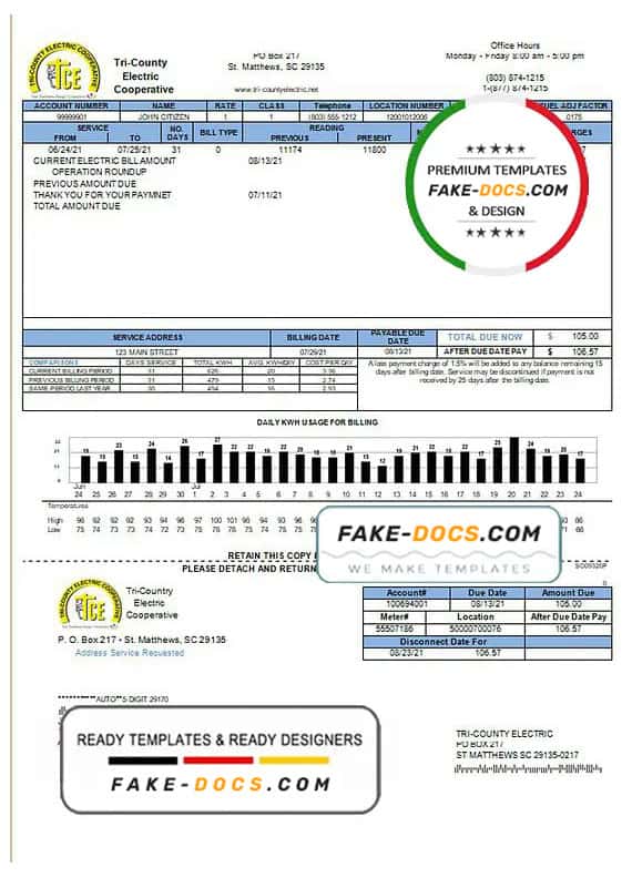 USA Tri-County Electric Cooperative utility bill Word template . Fully editable Word template. High quality template. Easy to customize, Layer based, fonts included. you can edit this template and put any name, address, license number, Id number, birth date, height, weight, expire date etc. This Word template is a easy to Editing.To modify this Word template file you will need a Word editing software such as Microsoft Word. Never used low quality template. Your account may be suspended.