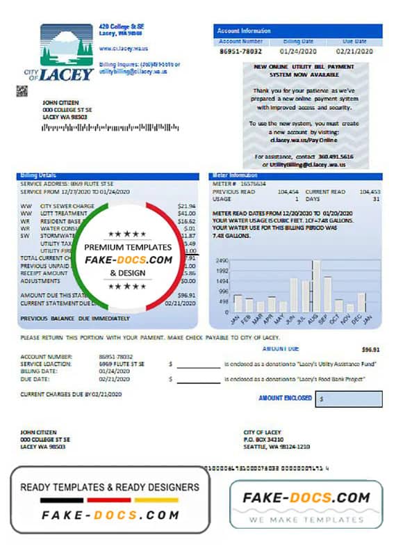 Grab now fully editable USA Washington City of Lacey water utility bill Template from our website fake docs and put your own info to create a fake copy of Fake USA Washington City of Lacey water Utility Bill for proof of address and ready your own novelty documents. It’ll be so beneficial if your utility bill is expired, stolen or not available. We also have passport psd template, ID Card psd template, Bank Statement psd template, drivers license psd template & Utility bill psd template