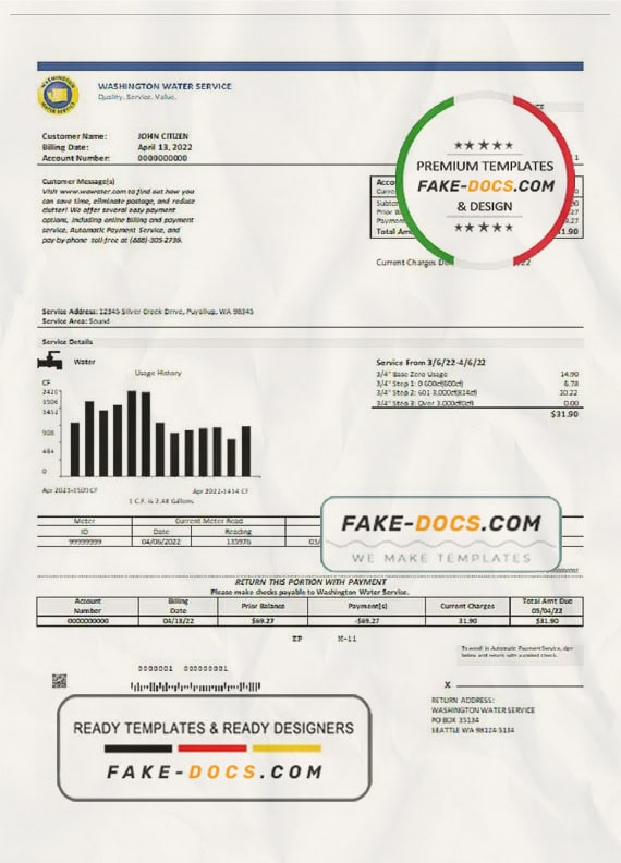 Grab now fully editable USA Washington Water Service utility bill Template from our website fake docs and put your own info to create a fake copy of Fake USA Washington Water Service Utility Bill for proof of address and ready your own novelty documents. It’ll be so beneficial if your utility bill is expired, stolen or not available. We also have passport psd template, ID Card psd template, Bank Statement psd template, drivers license psd template & Utility bill psd template