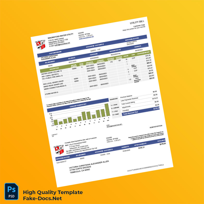 USA Wauwatosa Water Utility Editable Water Bill Template