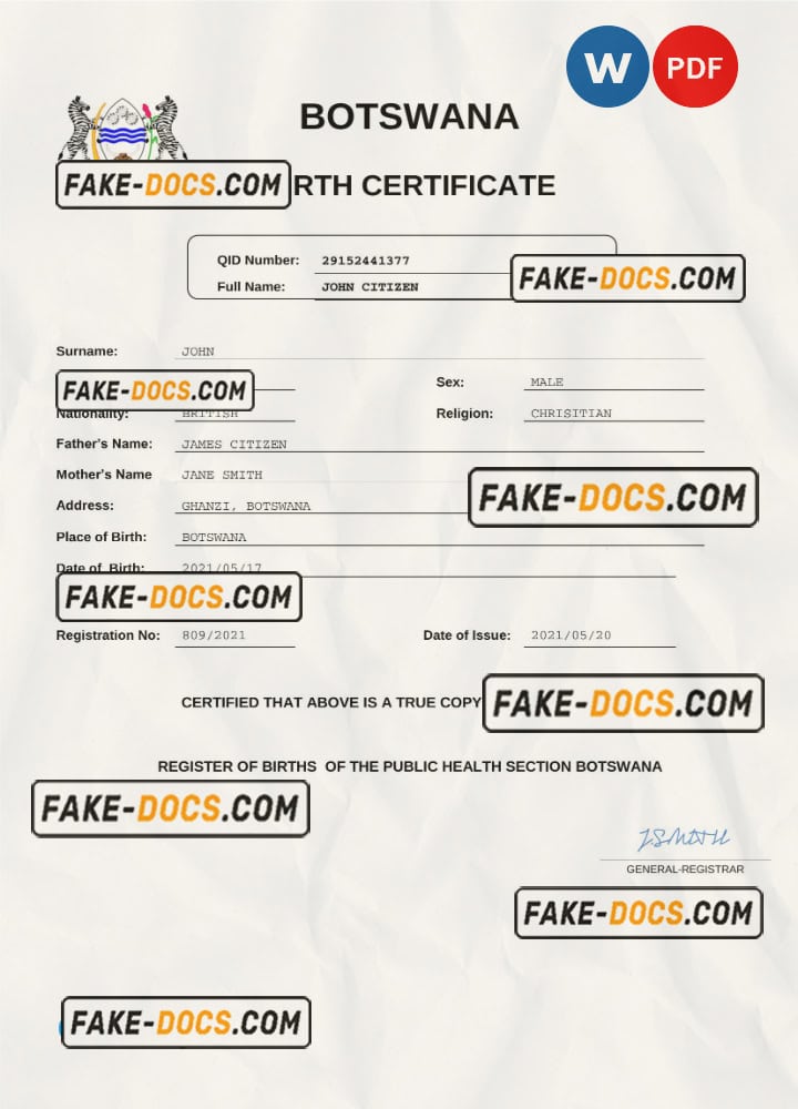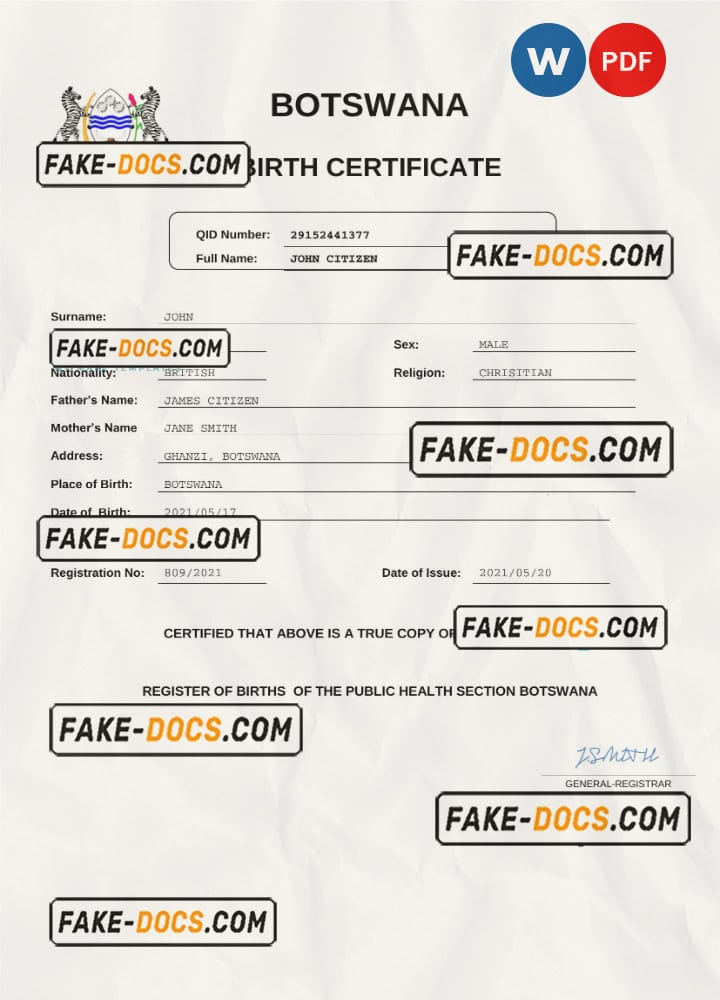 certificateBotswana birth certificate Word and PDF template, completely editable- High Quality template