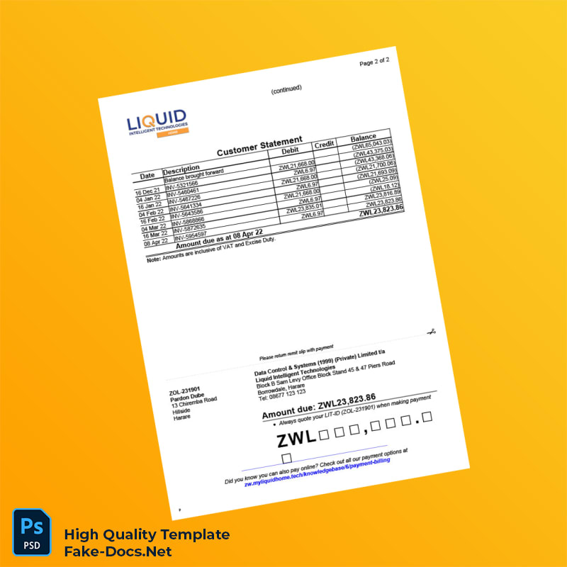 Zimbabwe Liquid Intelligent Technologies Fiscal Tax Invoice Template in Word and PDF formats 2 page